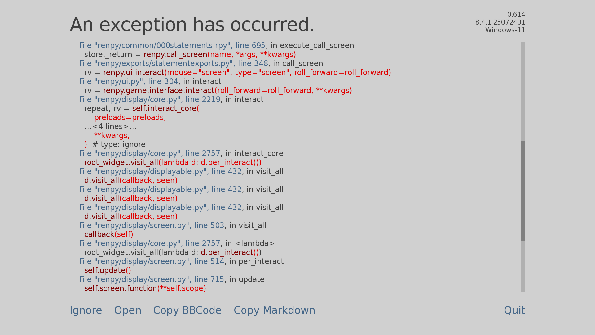 File "F:\Crakeados\DigiworldAdventure-0.42-pc\renpy\exports.py", line 3420, in call_screen