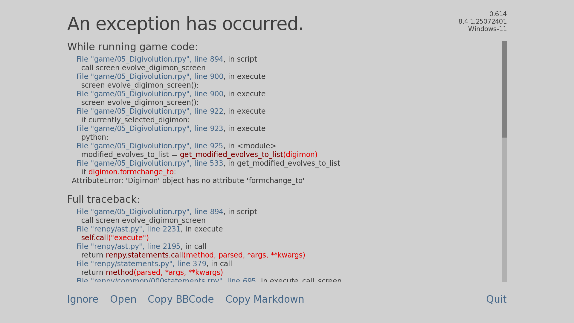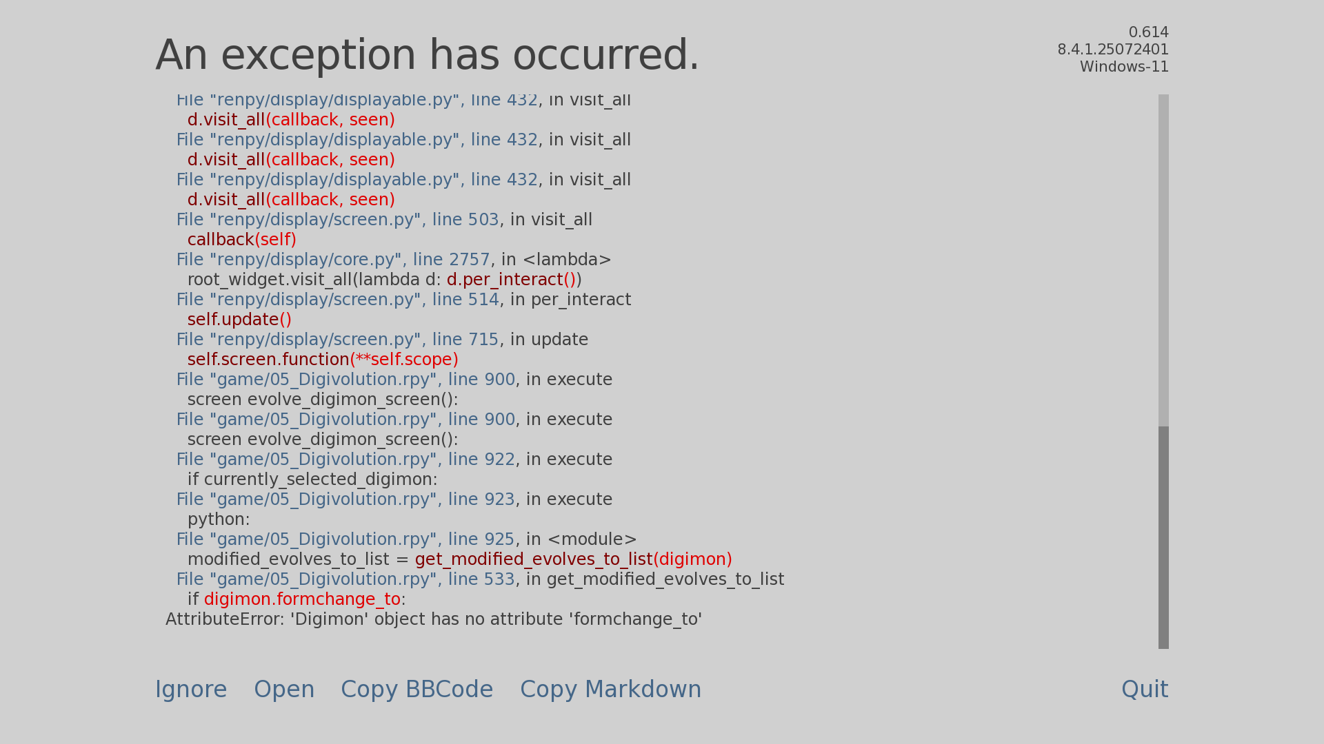 recently downloaded the latest version of the game and made sure to press th fix save option for all my saves from older versions (I also made sure to save them again so they'll stay that way) and I keep getting this error every time I try to enter the Digivolve menu specifically with my first ever save from when I first downloaded the game at an older version (also separated into multiple screenshots because that's more convenient for me to share the error):